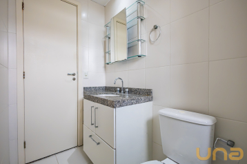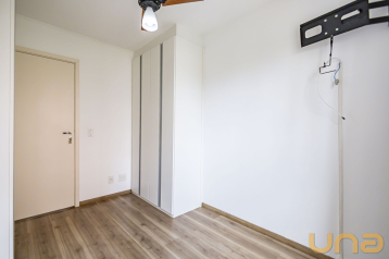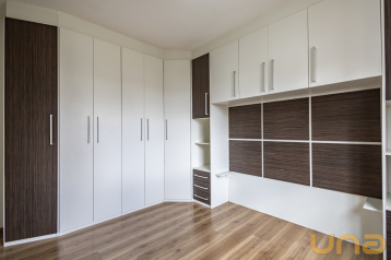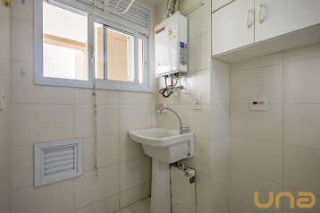 Apartamento de 1 dormitório conta com suíte e armário planejado. A sala é integrada à cozinha, que possui pia com armário, proporcionando praticidade e aproveitamento de espaço. Há ainda uma ampla lavanderia separada, equipada com armários, oferecendo mais comodidade no dia a dia.