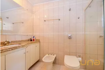 Suíte master com closet espaçoso, sacada privativa e banheiro com duas cubas;